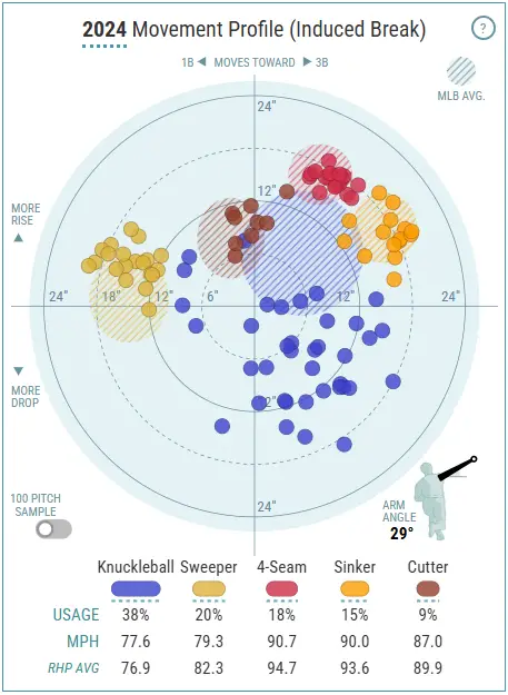 I was surprised to see he only had five wild pitches last season, but Padres catchers led baseball with 16 passed balls thanks in part to Waldron’s signature pitch. For example, Kyle Higashioka had seven PBs on the knuckler last season. His Baseball Savant movement profile is unlike anything you’ll see from a traditional pitcher, what with the crazy sawed-off shotgun blast of distribution points.