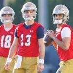 Notre Dame opened Spring practice this past week in South Bend. One of the biggest storylines for the Fighting Irish this Spring is the high-stakes contest to fill the void at quarterback. With Riley Leonard gone, Steve Angeli, CJ Carr, and Kenny Minchey are vying to claim the coveted role of QB1. As practices heat up, the quarterback competition will be under intense scrutiny. … [Read more...] about Quarterback Battle Looms as Notre Dame Opens Spring Practice