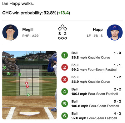 Okay, the Cubs will take that! Tying run on base. But Tucker struck out, and that brought up Seiya Suzuki. He grounded into a double play to end the game, but as you can see here… pitch 5, which was called ball three, could have been called strike three. At least then, PCA would have come to bat!