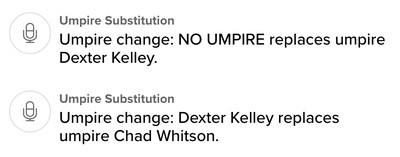 Dexter Kelley, the second-base umpire, went behind the plate and the game was completed with three umpires.