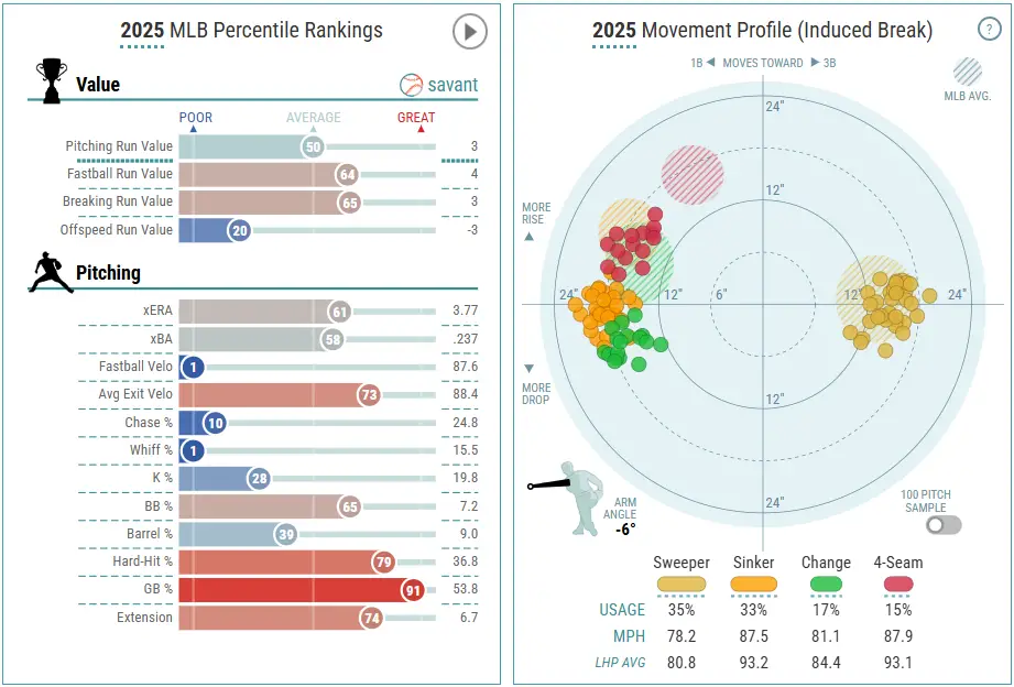 Though his fastball didn’t quite average 88 mph last season, Milner relies far more on his sinker and sweeper. Even his changeup sees more usage than his warmer as he leans into that low slot to keep the ball on the ground with most of his pitches landing armside and low. The sweeper actually finds the heart of the zone very frequently, though coming from the batter’s hip creates enough deception to keep it from being hit hard in the air too often.
