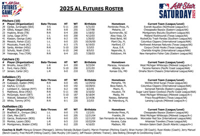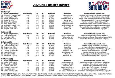 The Futures Game will be played at 3 p.m. Saturday, July 12 at Truist Park in Atlanta. It will be broadcast live on MLB Network and simulcast on MLB.TV, MLB.com and in the MLB App with Melanie Newman (play-by-play), Yonder Alonso (analyst), Jonathan Mayo (analyst) and Sande Charles (reporter).