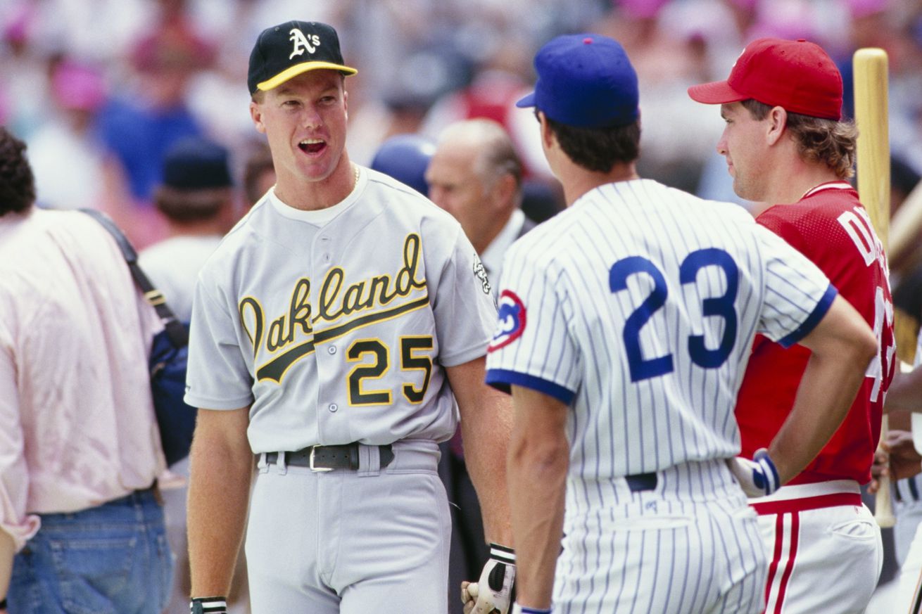 Ryne Sandberg and Mark McGwire prepare for the 1990 Home Run Derby | Photo by Steve Goldstein/Getty Images