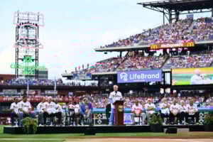 The Phillies’ opponent in the 1980 World Series was the Kansas City Royals. Both teams were looking for their first championship at the time. Furthermore, both teams were led by their league MVP third baseman: Schmidt for the Phillies and George Brett for the Royals. The home teams won each of the first four games before the Phillies took Game 5 on the road. In Game 6, Carlton would pitch seven innings, allowing four hits and one run. Pete Rose would go 3-for-4 at the plate while Schmidt drove in a run. Tug McGraw recorded his fourth postseason save, a six-out save, to secure a 4-3 win and the World Series title. Schmidt took home World Series MVP honors, hitting .381 with two homers and seven RBI in the six games.