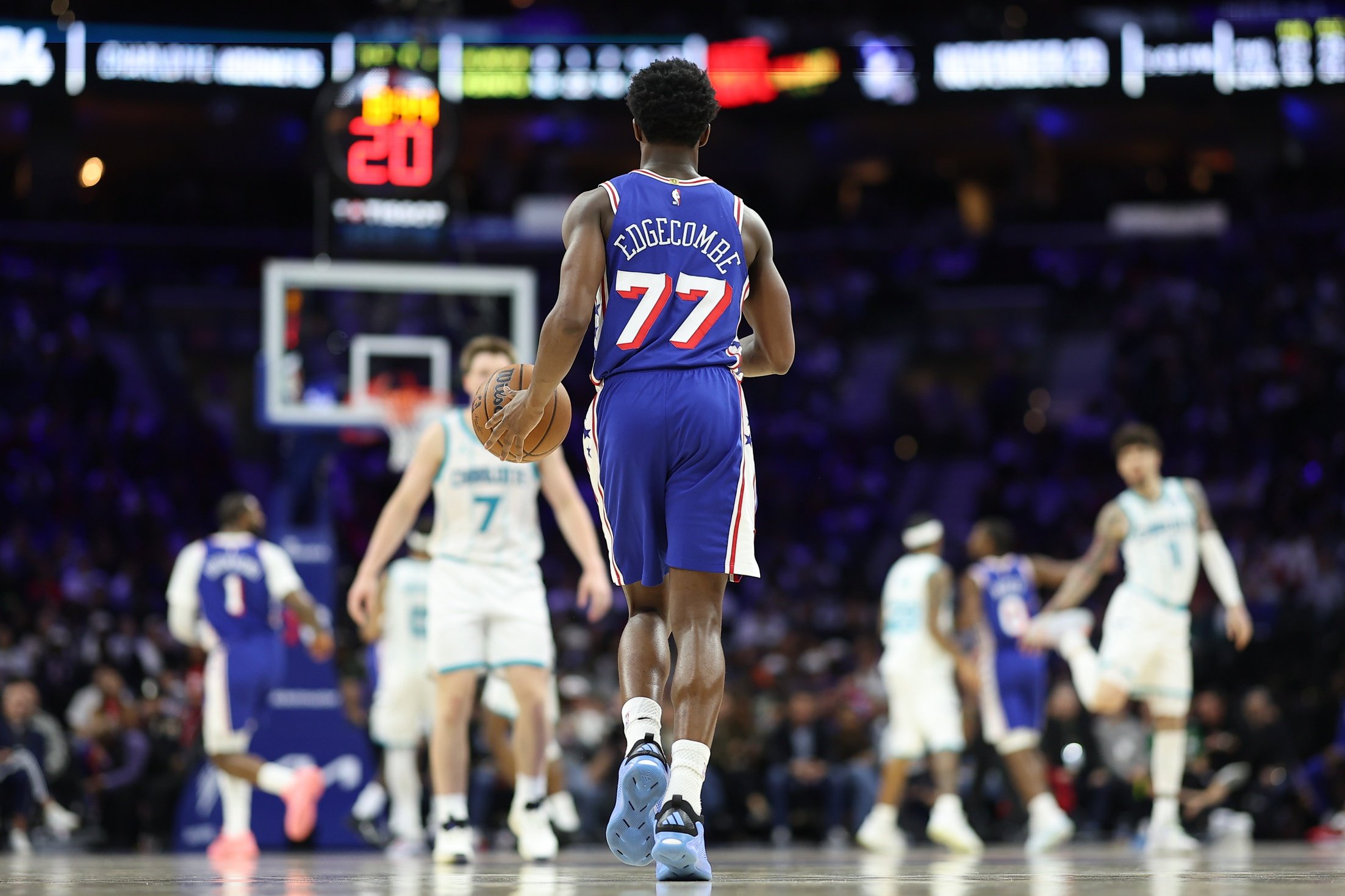 Oct 25, 2025; Philadelphia, Pennsylvania, USA; Philadelphia 76ers guard VJ Edgecombe (77) dribbles up court against the Charlotte Hornets during the fourth quarter at Xfinity Mobile Arena. Mandatory Credit: Bill Streicher-Imagn Images