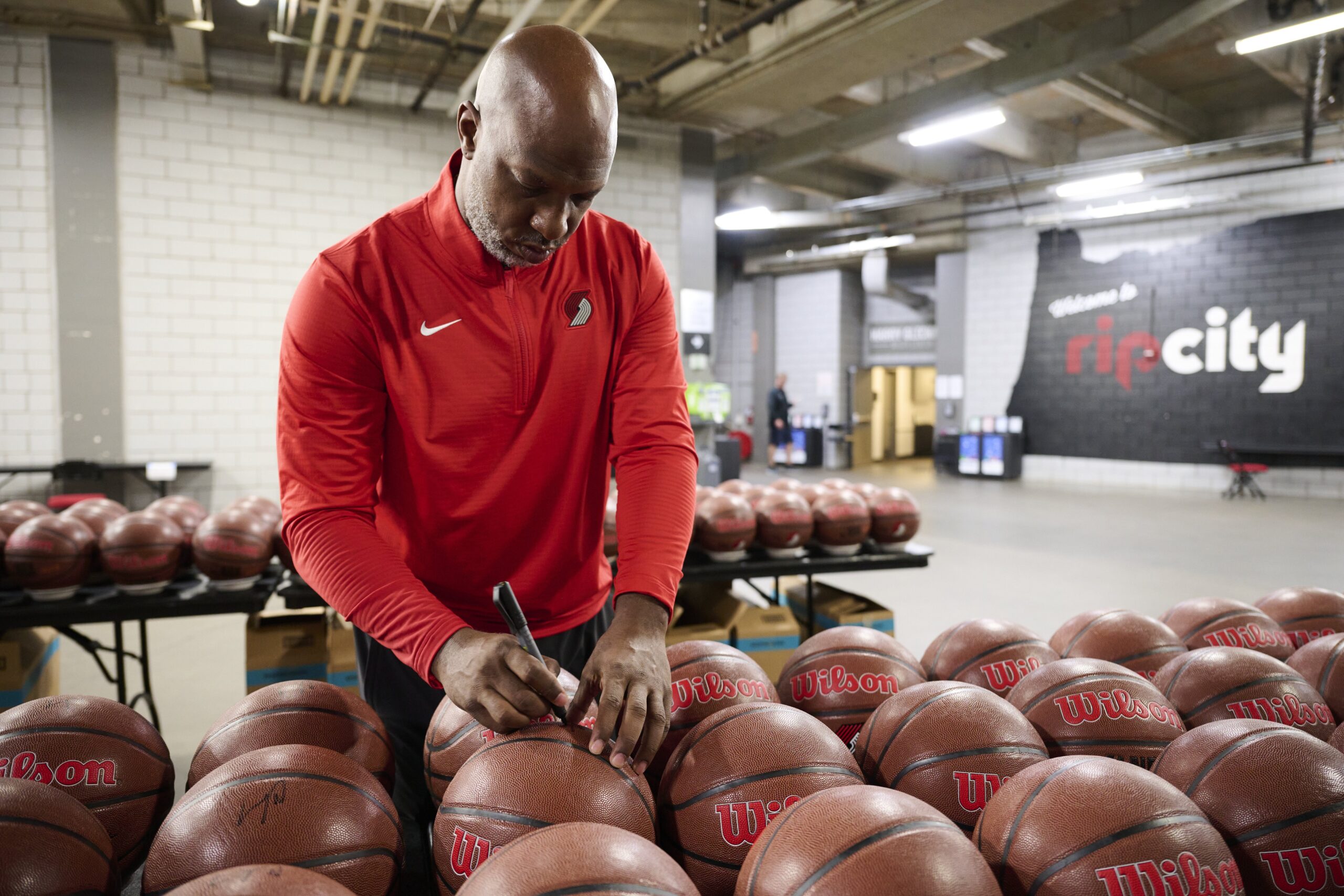Sep 29, 2025; Portland, OR, USA; Portland Trail Blazers head coach Chauncey Billups signs basketballs during media day at the Moda Center. Mandatory Credit: Troy Wayrynen-Imagn Images