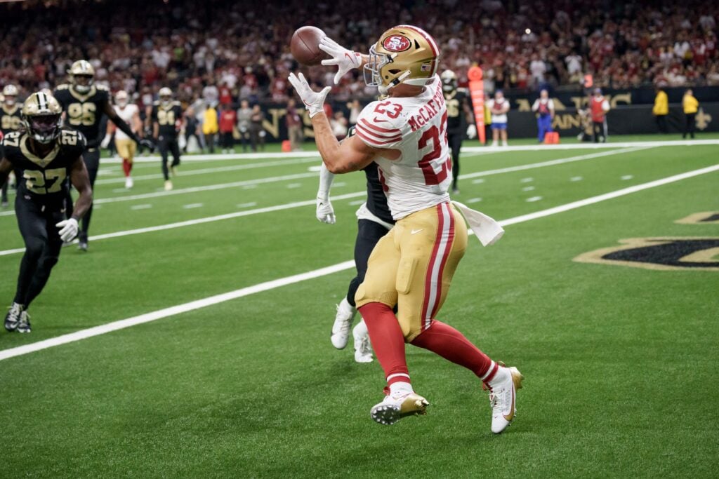 RB Christian McCaffrey will lead the 49ers in receiving yards.