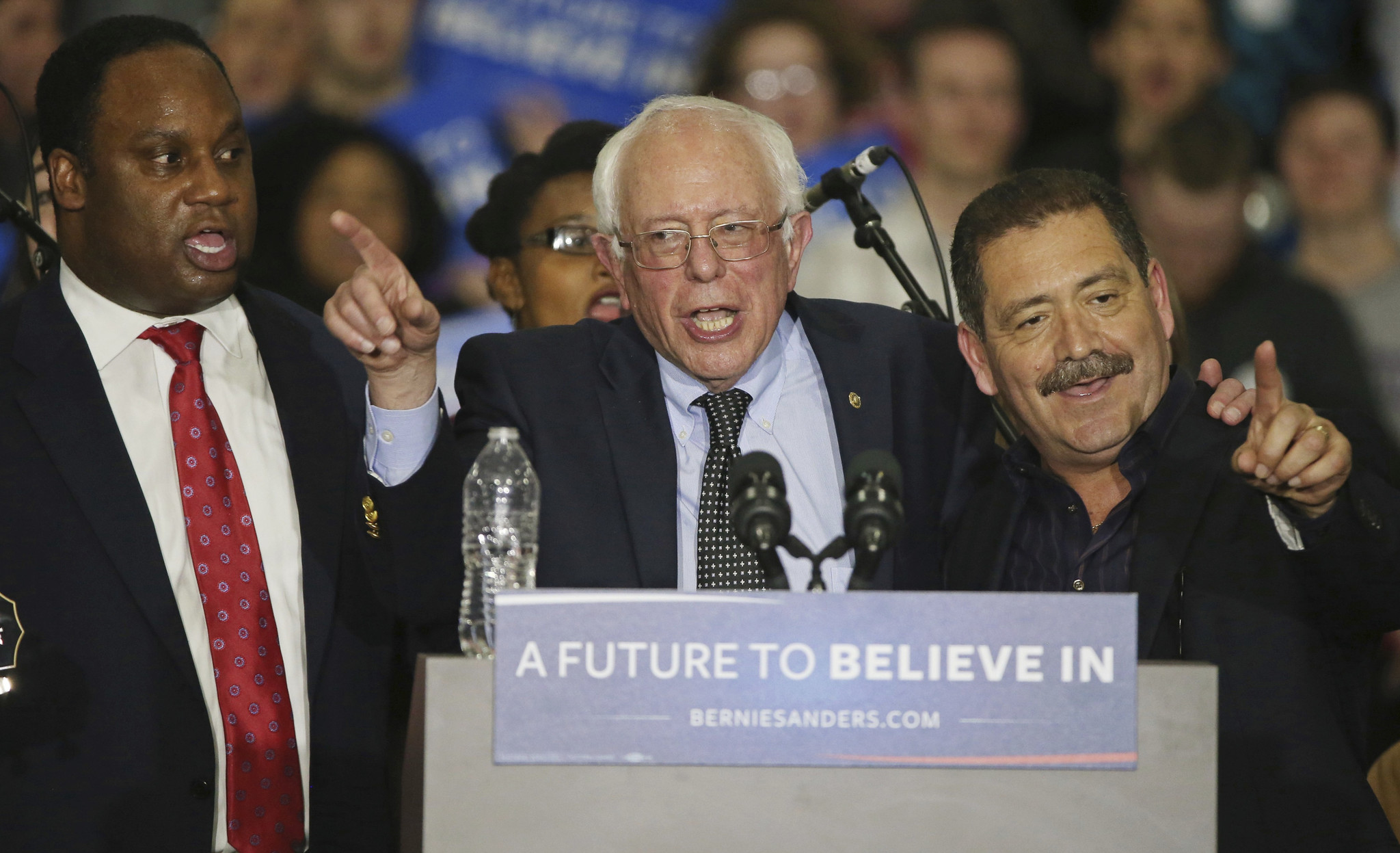 Then-presidential candidate Bernie Sanders, center, sings Woody Guthrie’s “This Land is Your Land” with Jonathan Jackson, left, and Jesus “Chuy” Garcia at a rally at Argo Community High School, March 11, 2016, in Summit.