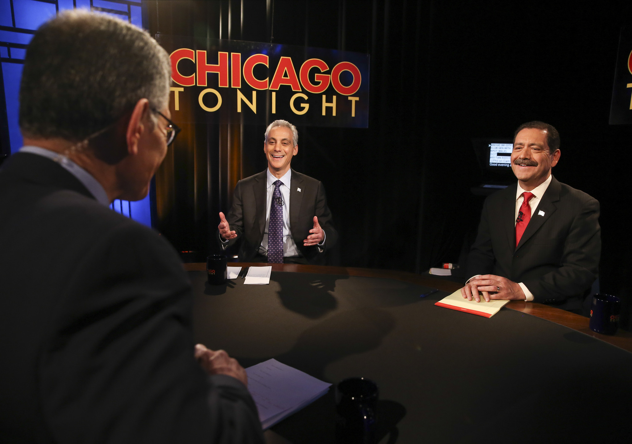 Mayor Rahm Emanuel, left, and challenger Jesus “Chuy” Garcia share a laugh with WTTW-Ch. 11 moderator Phil Ponce on March 31, 2015, before the start of their final televised debate in Chicago.