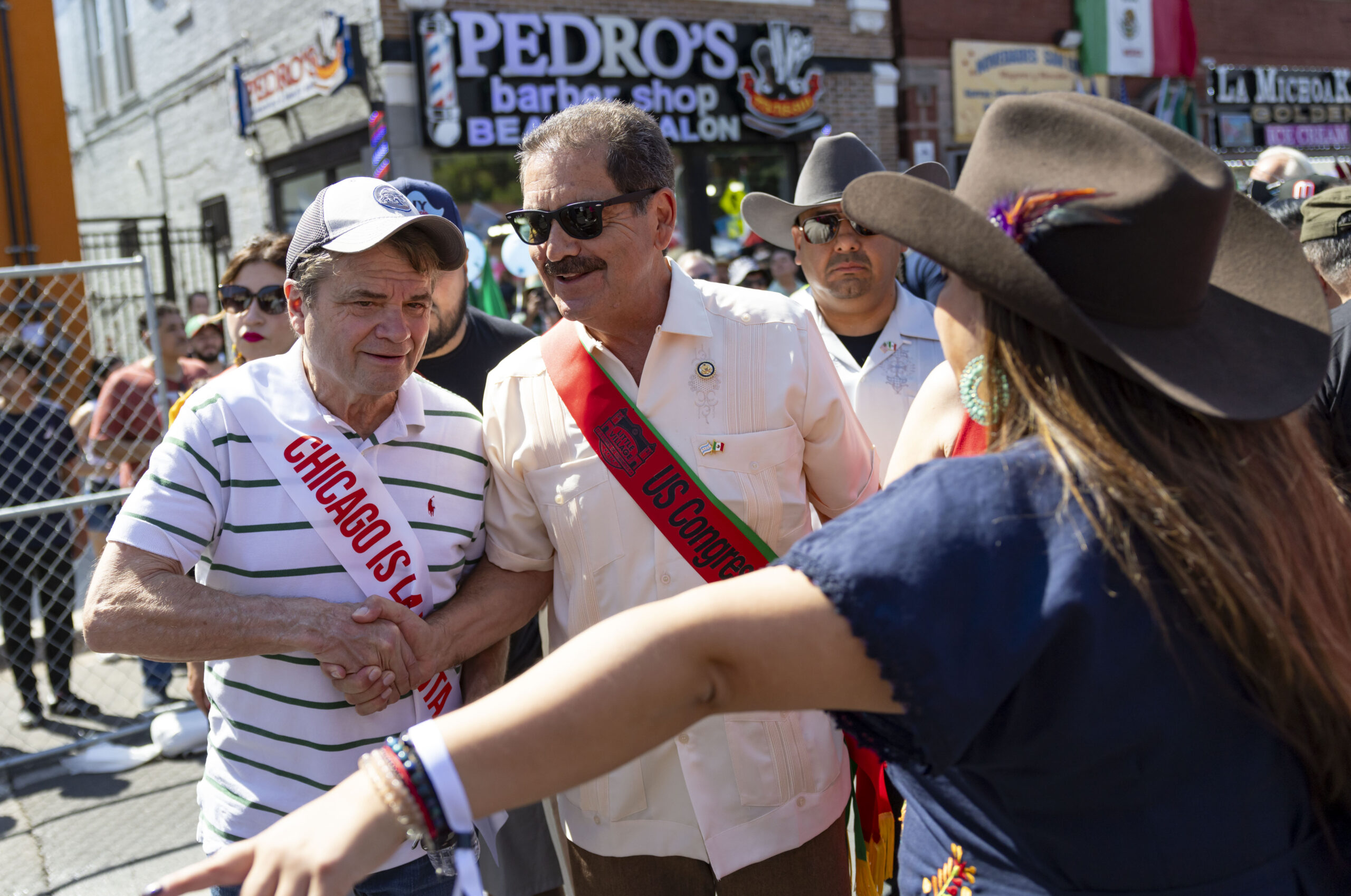 • U.S. Rep. Mike Quigley, left, and U.S. Rep. Jesús “Chuy” García greet before the 26th Street Mexican Independence Day Parade on Sept. 14, 2025, in Chicago’s Little Village neighborhood. (Brian Cassella/Chicago Tribune)