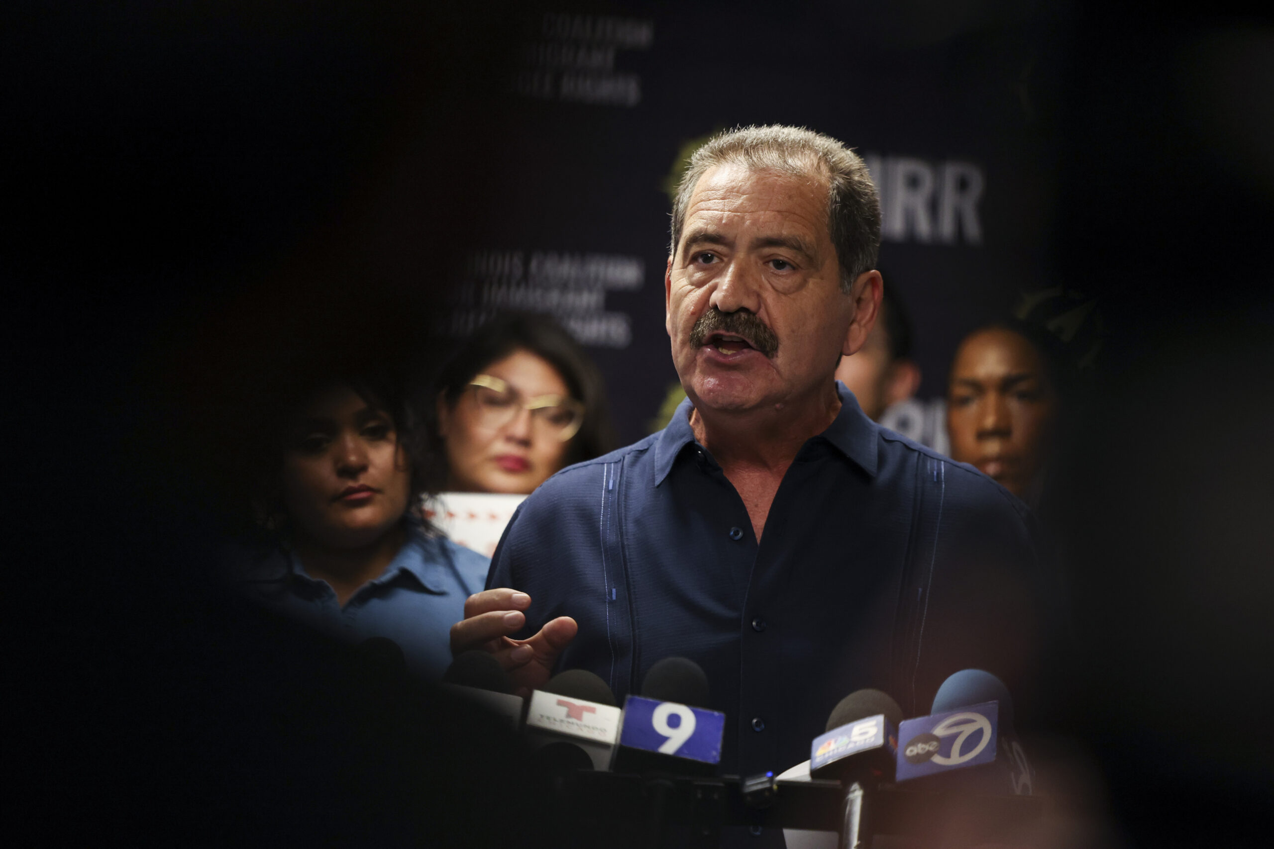• U.S. Rep. Jesús “Chuy” García speaks during a news conference at the Illinois Coalition for Immigrant and Refugee Rights headquarters in the Loop on Sept. 28, 2025. (Eileen T. Meslar/Chicago Tribune)