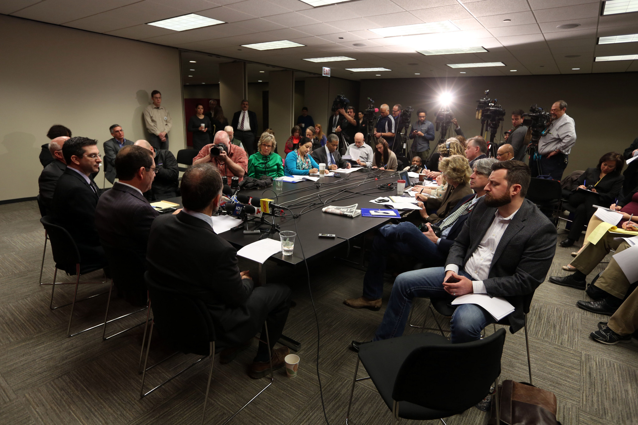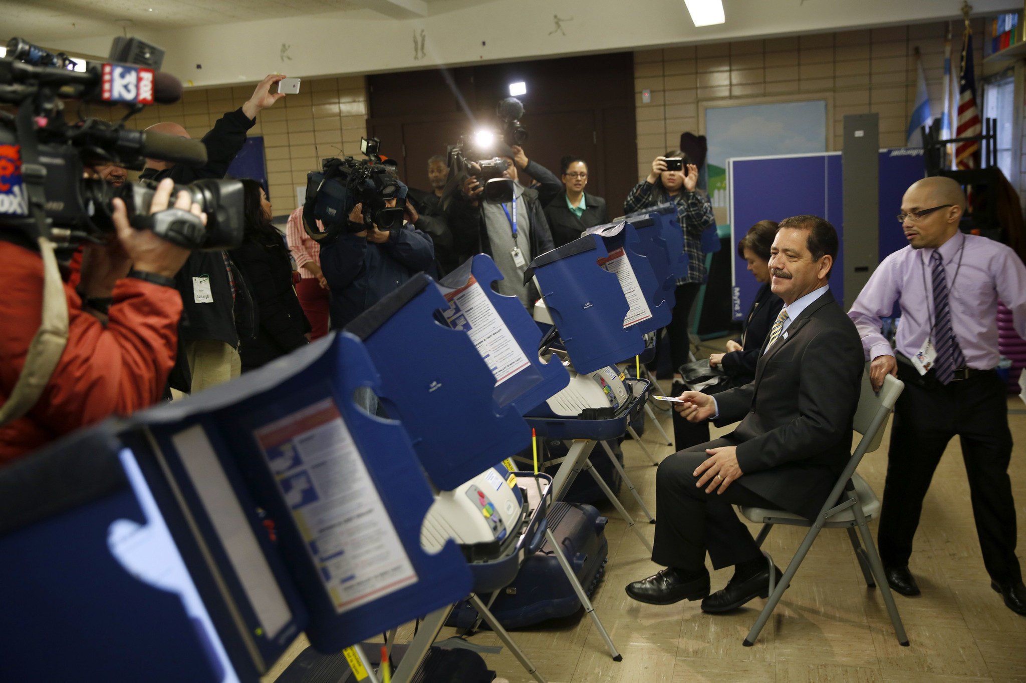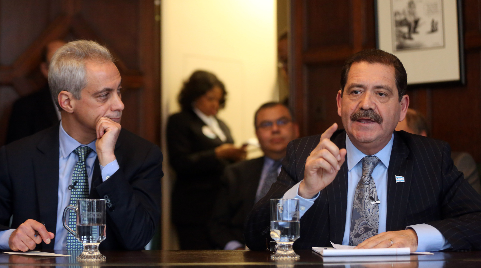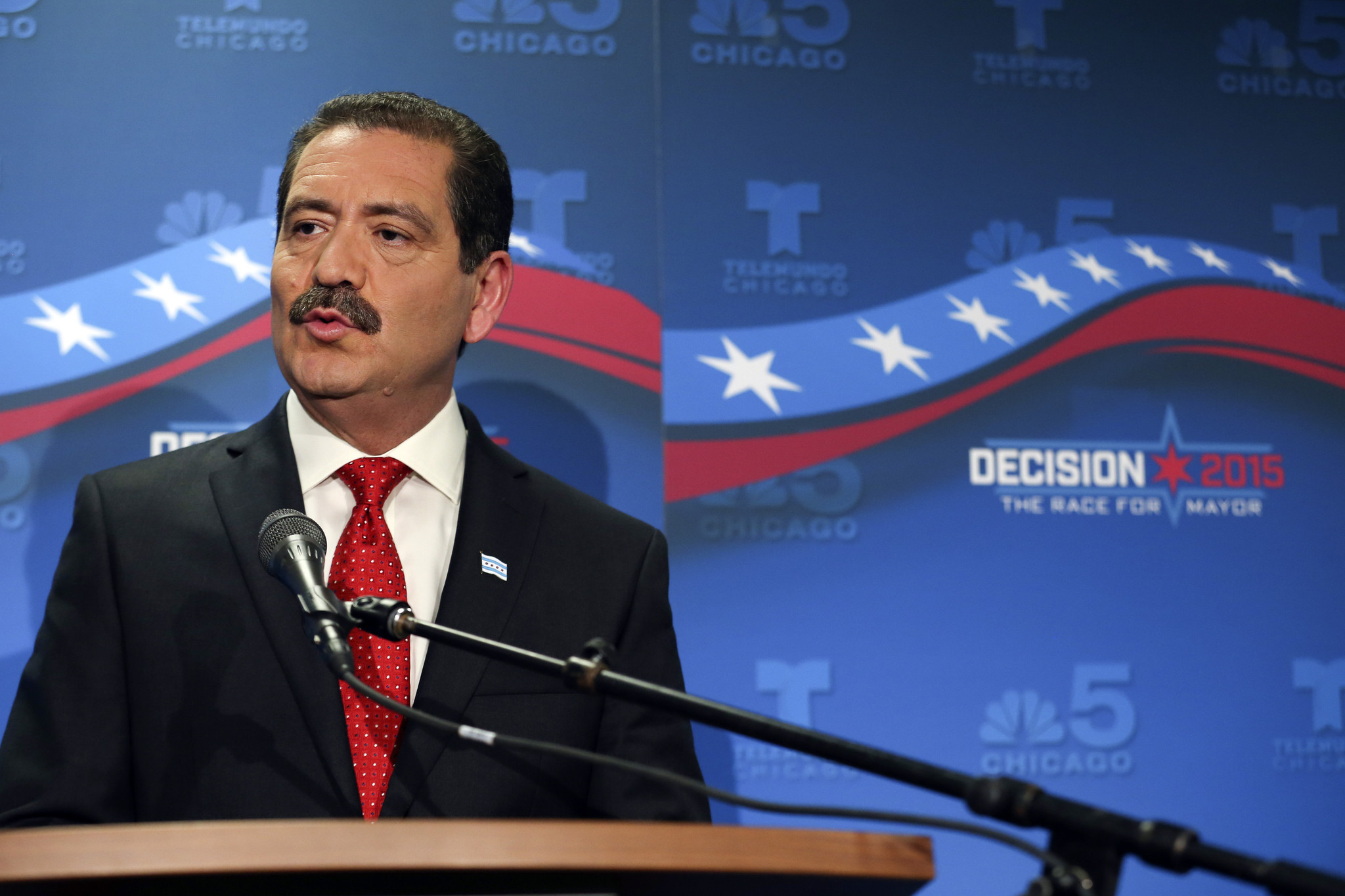 Chicago mayoral candidate Jesus “Chuy” Garcia, center at end of table, faces the media as he announces his budget plans at a news conference on Friday, March 13, 2015, at the law offices of Hughes, Socol, Piers, Resnick & Dym Ltd.