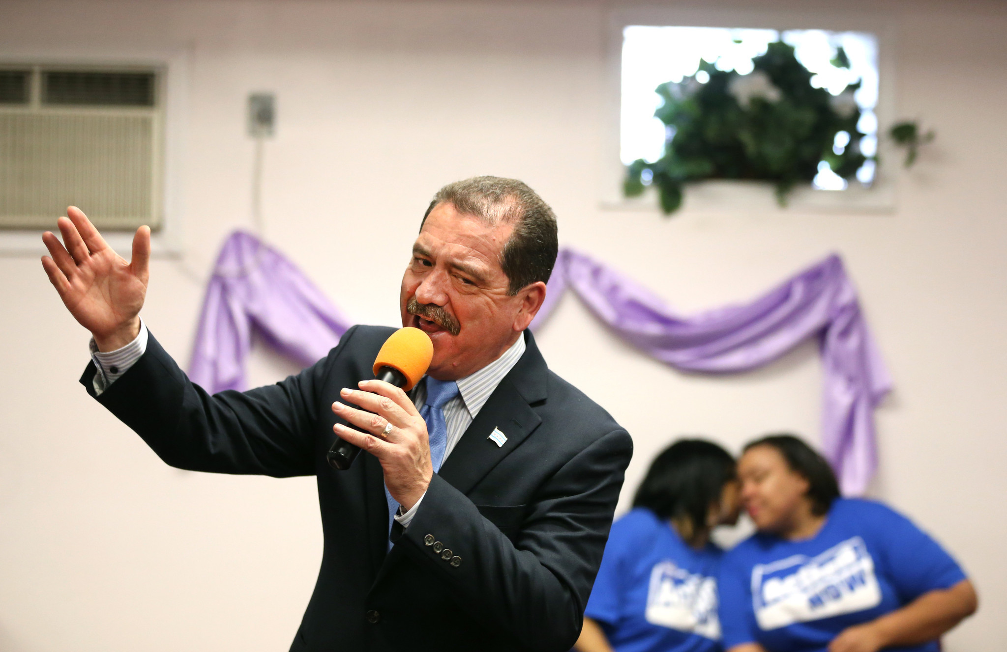 Chicago mayoral candidate Jesus “Chuy” Garcia speaks at a rally at a church at 8459 S. Racine Ave. on Chicago’s South Side on March 21, 2015.