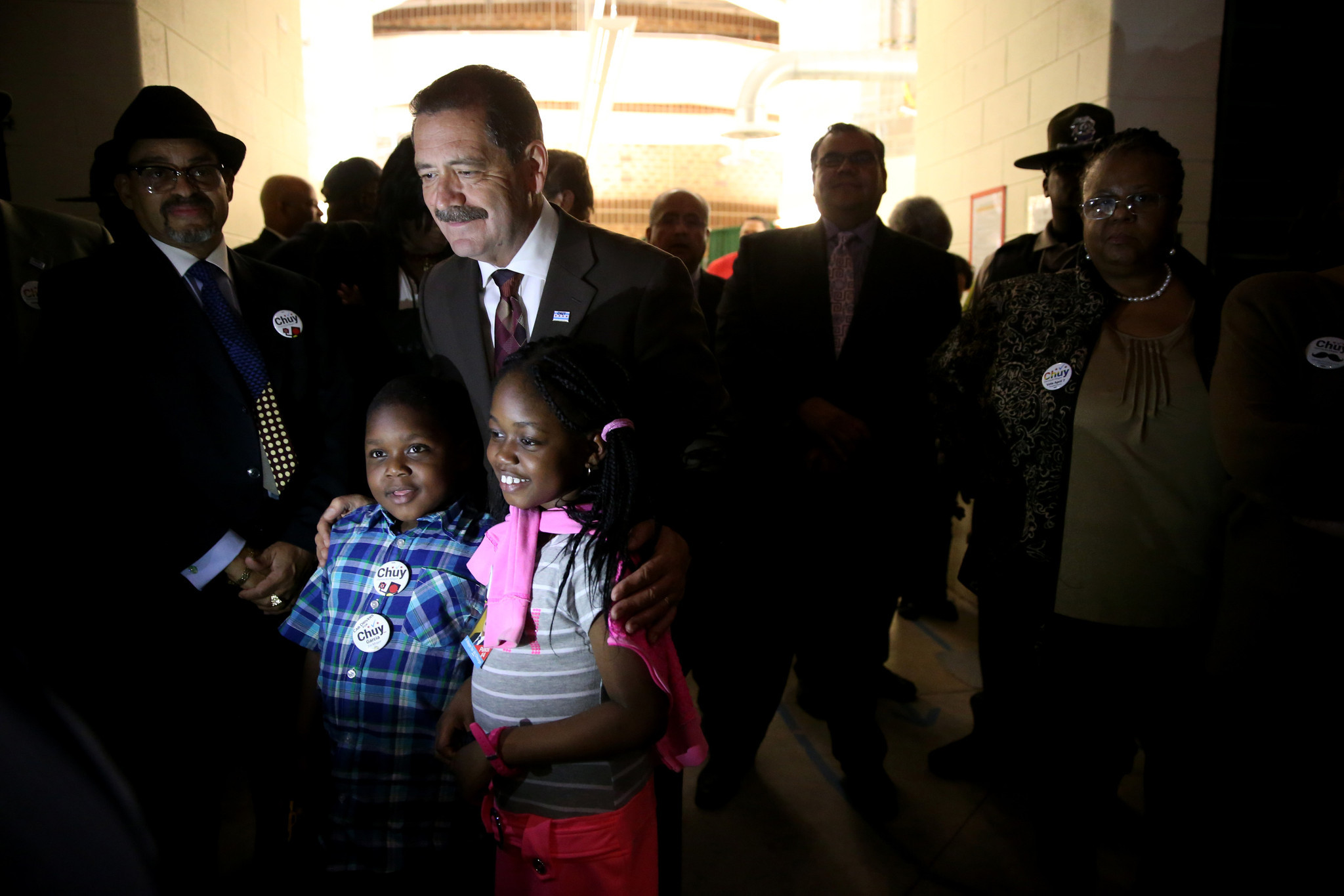 Chicago mayoral candidate Jesus “Chuy” Garcia takes a photograph with siblings Stephen, 5, and Elizabeth Caxton-Idowu, 7, at a rally for Garcia at Chicago State University on Saturday, April 4, 2015.
