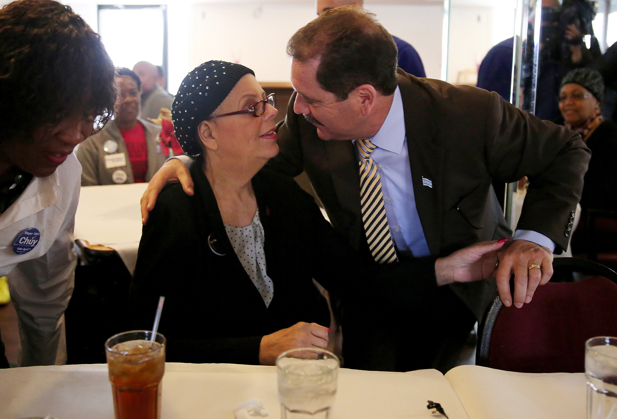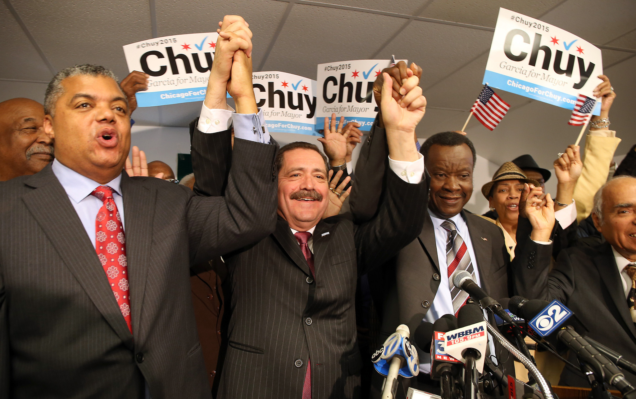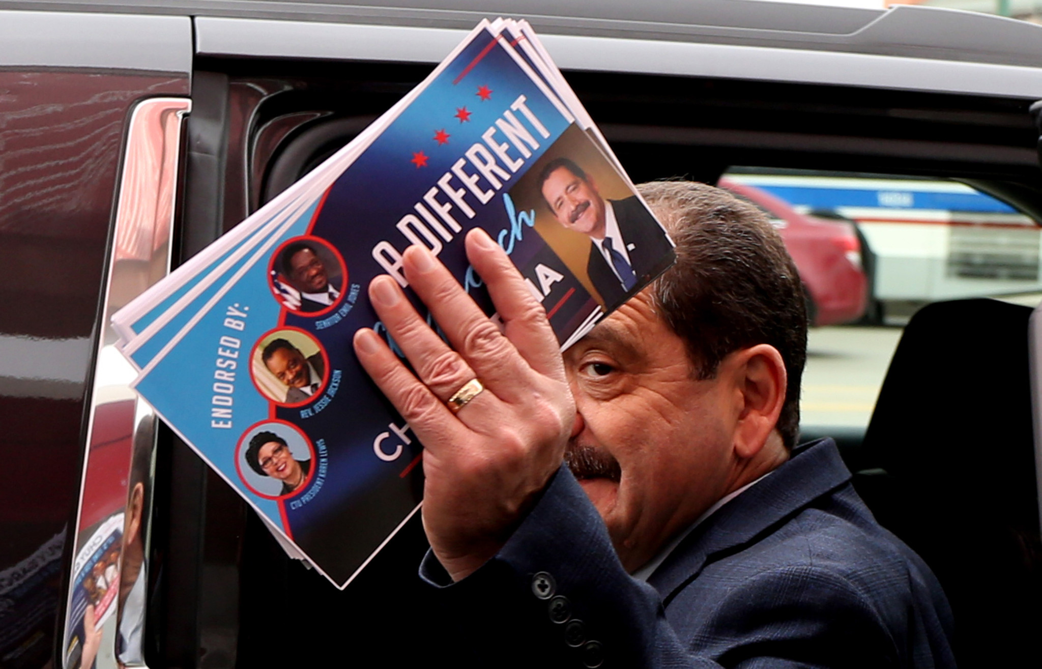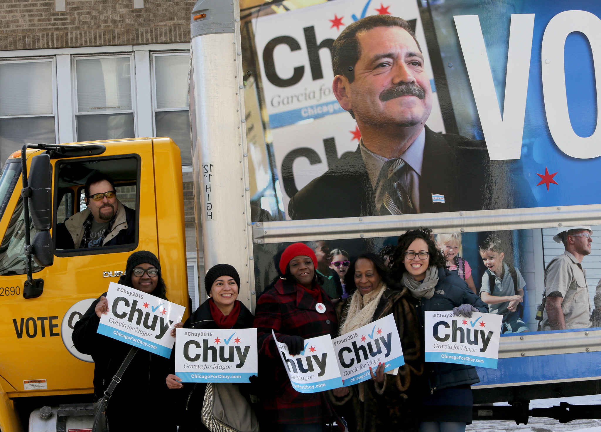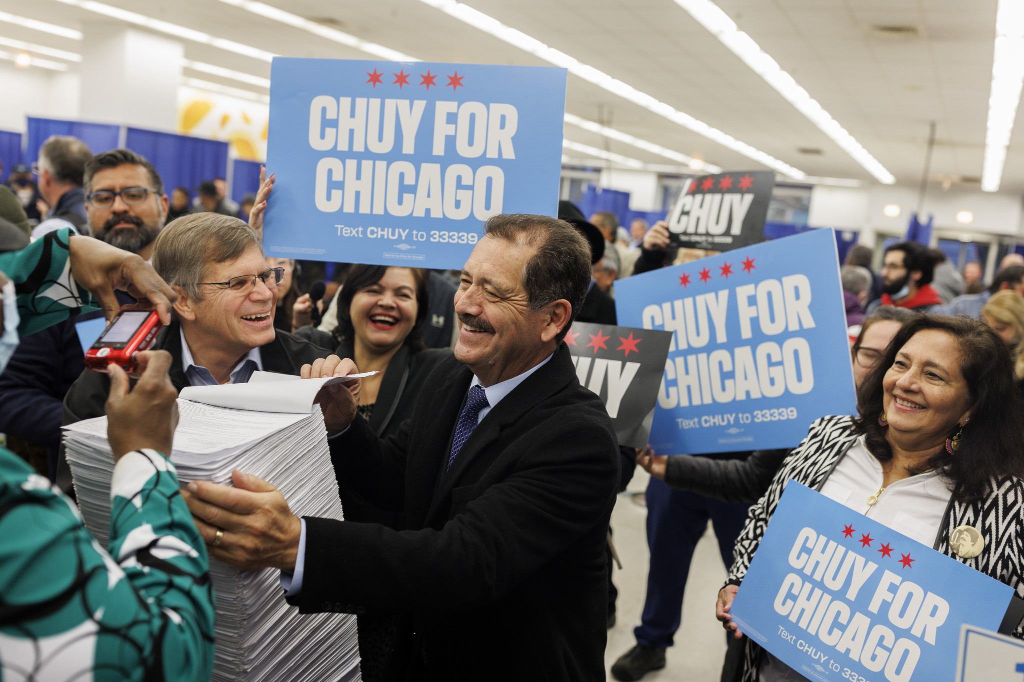 • Chicago mayoral candidate Jesús “Chuy” García greets supporters during a rally at...