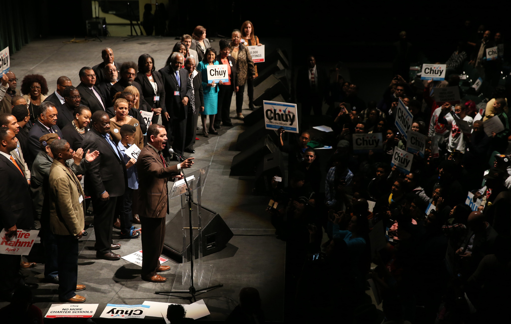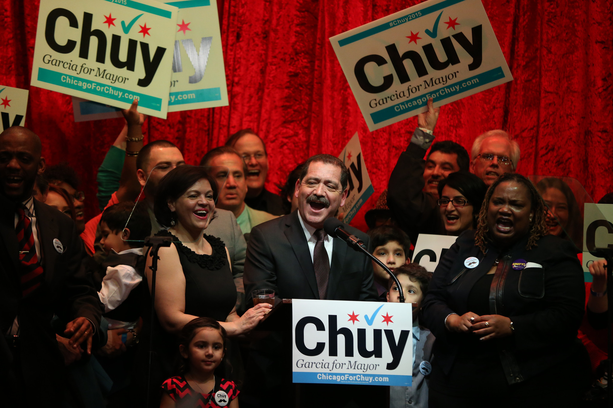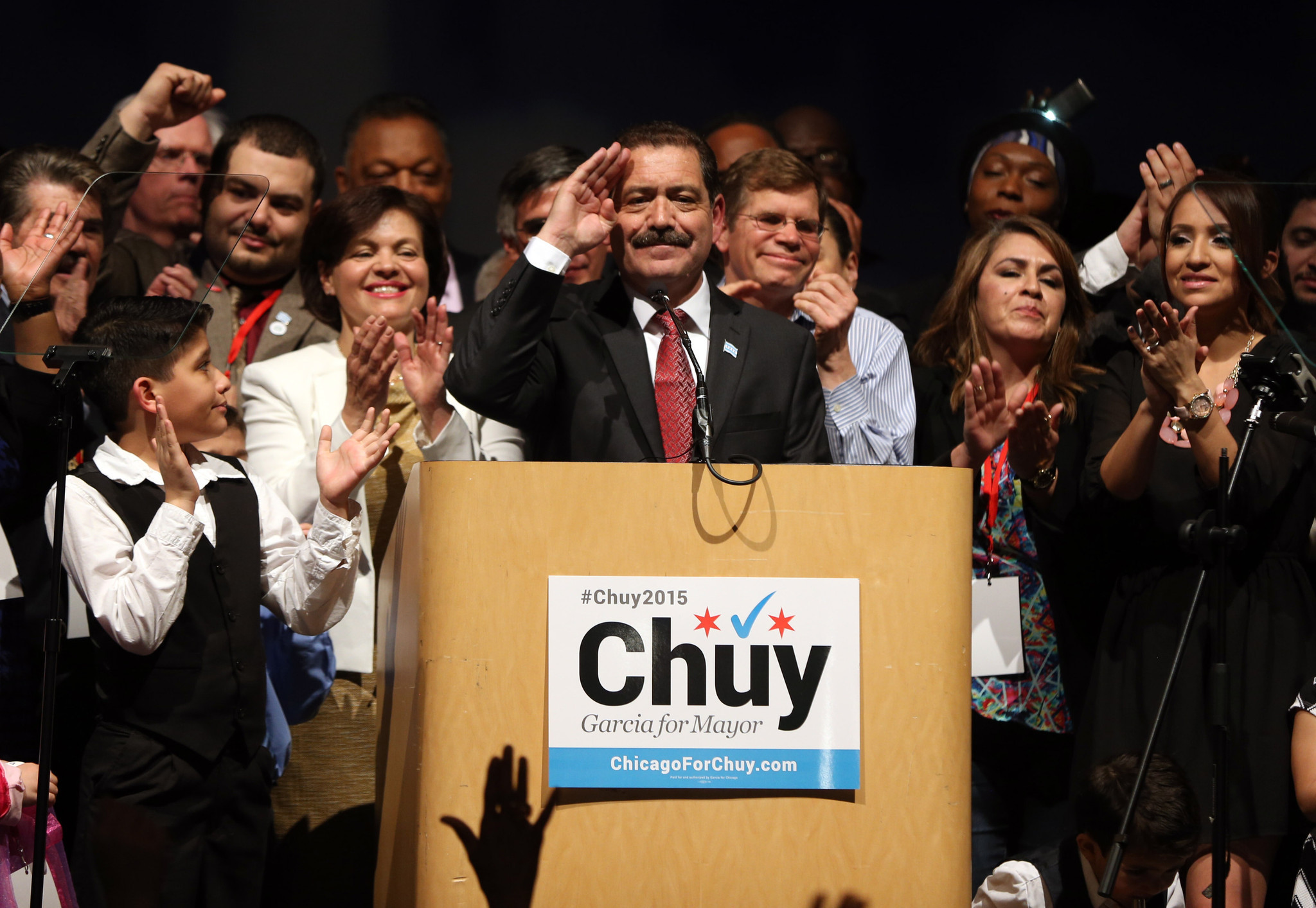 Mayoral candidate Jesus “Chuy” Garcia, with wife Evelyn, addresses supporters at his election night gathering Feb. 24, 2014, after winning enough votes to force a runoff with Mayor Rahm Emanuel.