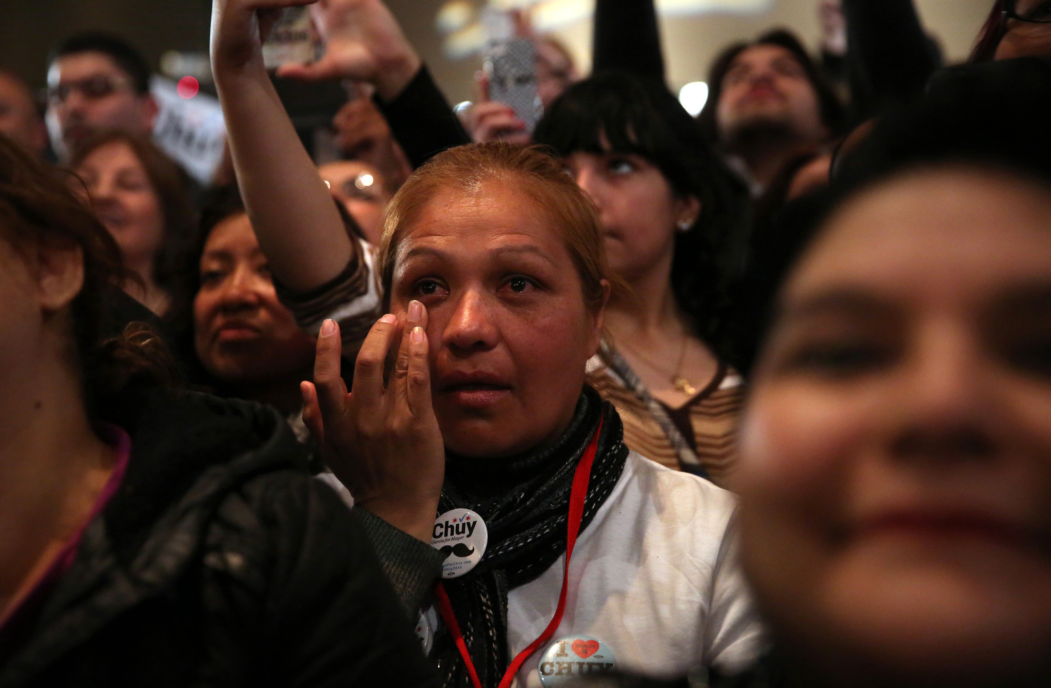 Supporters of mayoral candidate Jesus “Chuy” Garcia listen to his election night concession speech at the UIC Forum on April 15, 2015.