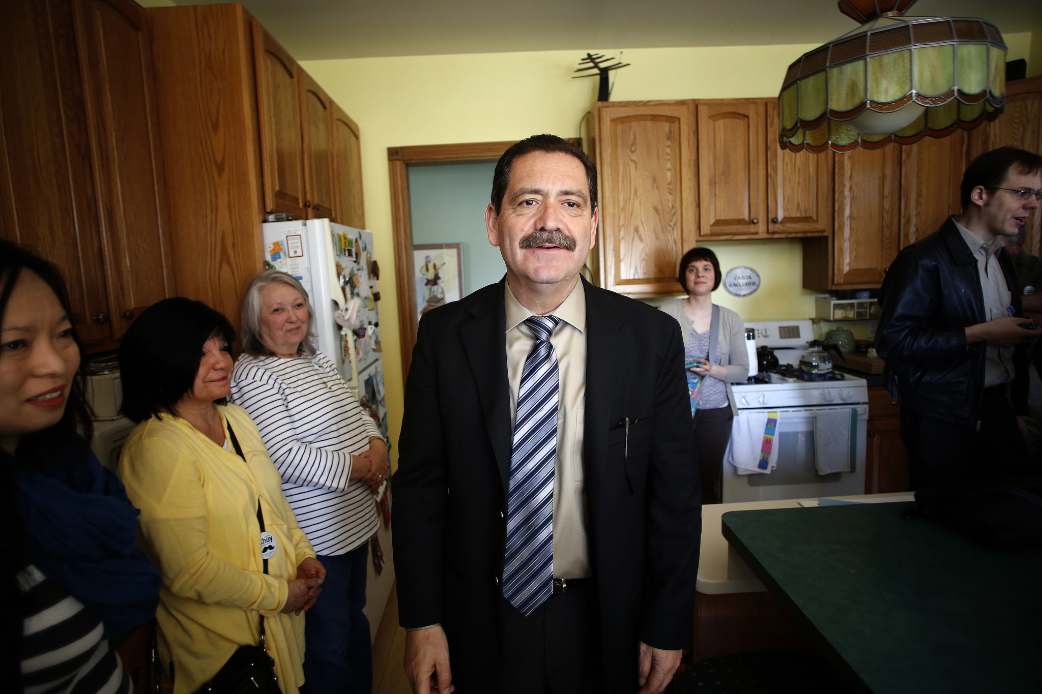 Mayoral candidate Jesus “Chuy” Garcia, joined by Kristen Polotsky, from left, Loretta Gagliardi and Cori McMillan, cuts a pastry before a kitchen table discussion April 1, 2015, on the Northwest Side about issues concerning the neighbors and friends of Frank and Loretta Gagliardi.