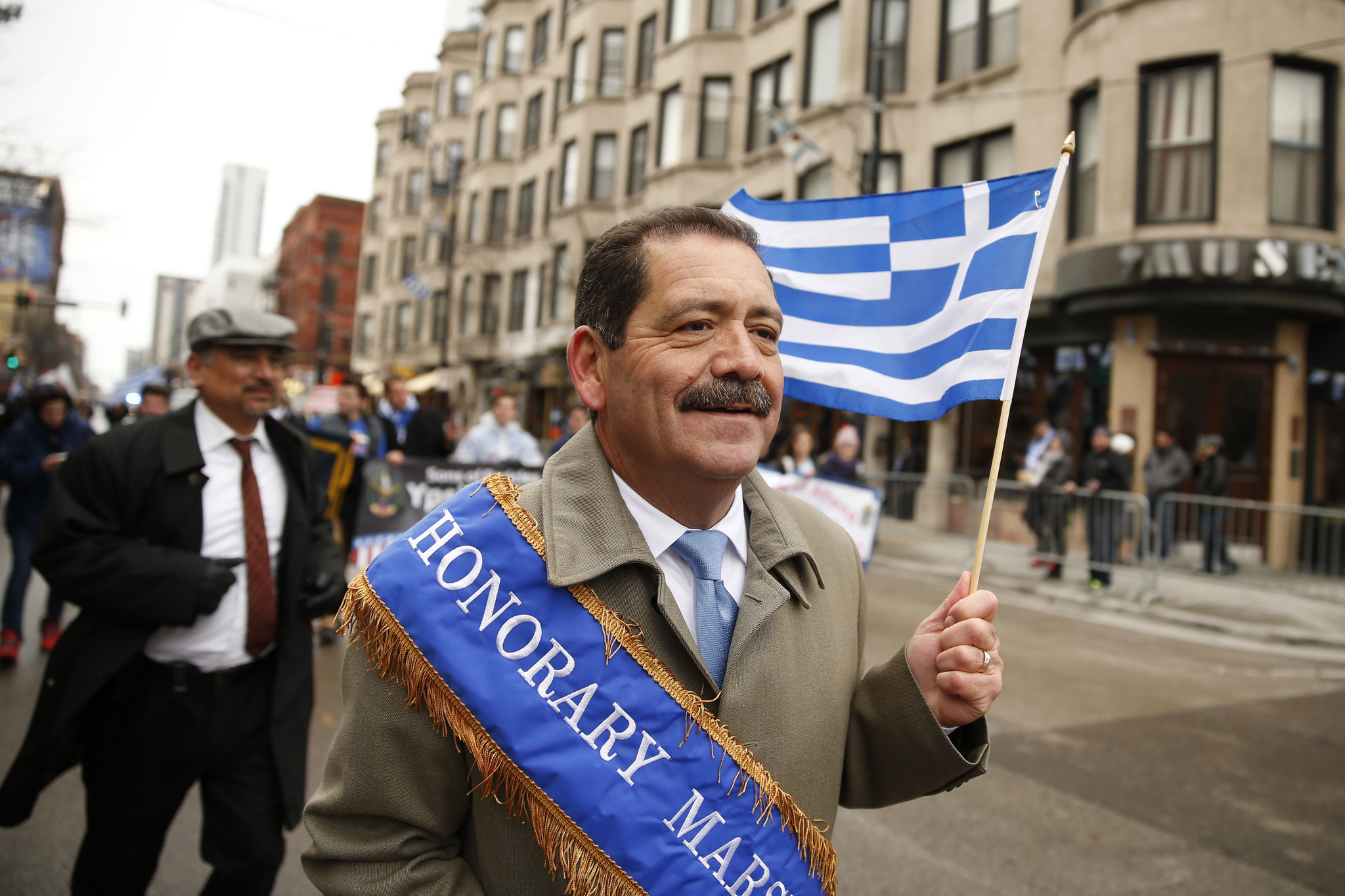 Jesus Chuy Garcia greets an enthusiastic crowd along the South Side St. Patrick’s Day parade route on March 15, 2015. Garcia was right at home at the parade because he was from St. Rita.