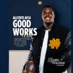 Big guy, big heart Aamil Wagner was a nice recruiting surprise for Notre Dame football, as many didn’t expect him to come to South Bend. Hailing from Marcus Freeman’s old high school in Ohio (Wayne), Wagner chose the Irish, and became an anchor on the line at right tackle for the entirety of Notre Dame’s 14-2 season in 2024. He’s also a very focused and determined individual … [Read more...] about Aamil Wagner Nominated for Allstate AFCA Good Works Team